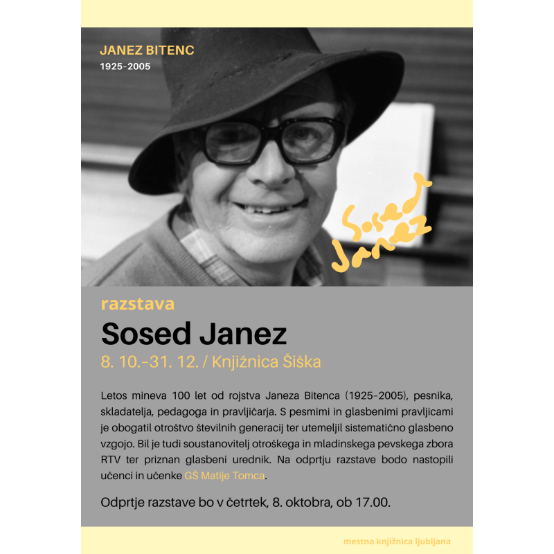 Vabljeni na otvoritev razstave posvečene 100 letnici rojstva Janeza Bitenca, ki je s pesmimi in pravljicami obogatil otroštvo mnogih generacij.