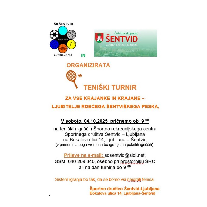 Športno društvo Šentvid vabi v soboto, 4. oktobra 2025 ob 9. uri ns teniški turnir namenjen vsem ljubiteljem rdečega peska.