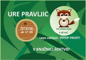v Knjižnici Šentvid – zeleni knjižnici ponovno izvajamo ure pravljic za vaše otroke. Potekajo v popoldanskem času enkrat tedensko, ob četrtkih, ob 17. uri, od oktobra do maja in trajajo eno šolsko uro.
